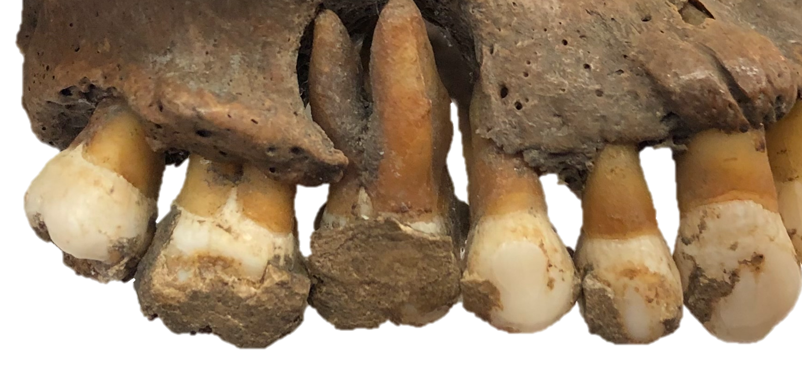 사람 위턱뼈에 두껍게 굳어 있는 치석(dental calculus). 살아 있는 동안 먹은 음식의 DNA·단백질·전분 알갱이가 이 광물화된 침전물 속에 그대로 갇혀 수만 년을 버틴다. 네안데르탈인의 치석에서 잿빛가루눈물버섯 DNA가 나온 것도 이 창 덕분이다. ⓒ Dr. Kelly Blevins / Wikimedia Commons (CC0)
